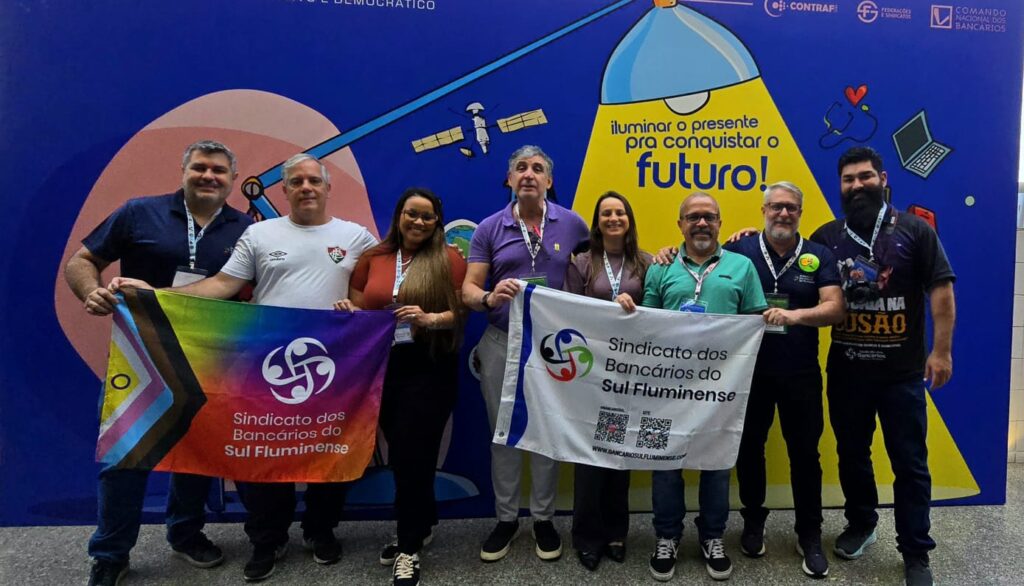 Bancárias e bancários de todo o país participaram, de 22 a 24 de agosto, da 27ª Conferência Nacional da categoria, em São Paulo. Os 629 delegados, sendo 366 homens e 263 mulheres, aprovaram resoluções da agenda de reivindicações e propostas do movimento sindical bancário sobre questões econômicas, sociais e políticas. O Sindicato dos Bancários do Sul Fluminense participou dos encontros dos bancos privados e públicos. A equipe contou com a participação do presidente Júlio Cunha e dos diretores Raphael Fagundes, Douglas Gil, Pericles Lameira (Cabral), Miguel Pereira, Albertina Dias (Tina), Cristiane Senra e Newton da Silva. Sobre os eventos, Júlio ressaltou que a união da categoria é importante não só para os trabalhadores, mas também para a conjuntura nacional: “Chamar atenção da categoria que os resultados dessa união, muito bem representada no resgate da história com greve de 1985, se refletem nos direitos conquistados, muitos de forma pioneira, para a classe trabalhadora. É importante que neste momento delicado em que o país se encontra, estejamos unidos e fortes para defender a soberania nacional.” Entre as resoluções da conferência, destacam-se a defesa da democracia, a soberania nacional e a reeleição do Presidente Lula. Também foi aprovada a realização de atos em defesa do Banco do Brasil, contra “publicações inverídicas e maliciosas que disseminam informação em redes sociais, com o objetivo de gerar pânico e induzir a população a decisões que podem prejudicar a sua saúde financeira”. Confira as 14 resoluções da 27ª Conferência Nacional dos Bancários: – Realizar ato nacional no dia 27 de agosto, em defesa do Banco do Brasil; – Reeleger o presidente Lula e apoiar candidaturas ligadas à classe trabalhadora; – Resolução sobre a regulação, com estatização do Sistema Financeiro Nacional; – Defesa dos Bancos e Empresas Públicas e a Importância dos Serviços Públicos; – Saúde e Condições de Trabalho; – Defesa da Soberania, da Democracia e do PIX; – Justiça Tributária Já! Que os super ricos paguem mais, para que o povo pague menos; – Regulação das redes sociais: uma urgência democrática!; – Redução da Jornada e Fim da Escala 6×1; – Resolução contra o fechamento de agências bancárias e em defesa do emprego bancário; – Regulação do Sistema Financeiro Nacional; – Formação da Classe Trabalhadora; – Comunicação Popular na Era das Redes Sociais; – Novas Formas de Mobilização. Os participantes da Conferência aprovaram também quatro moções: – De repúdio às práticas de contratação fraudulenta adotadas pelo banco Santander; – De apoio ao Supremo Tribunal Federal e em defesa da soberania nacional; – Contrária à pauta de anistia geral e irrestrita aos participantes da tentativa de golpe de 8 de janeiro de 2023; – Pelo fim do genocídio do povo palestino. *Fonte: Contraf-CUT