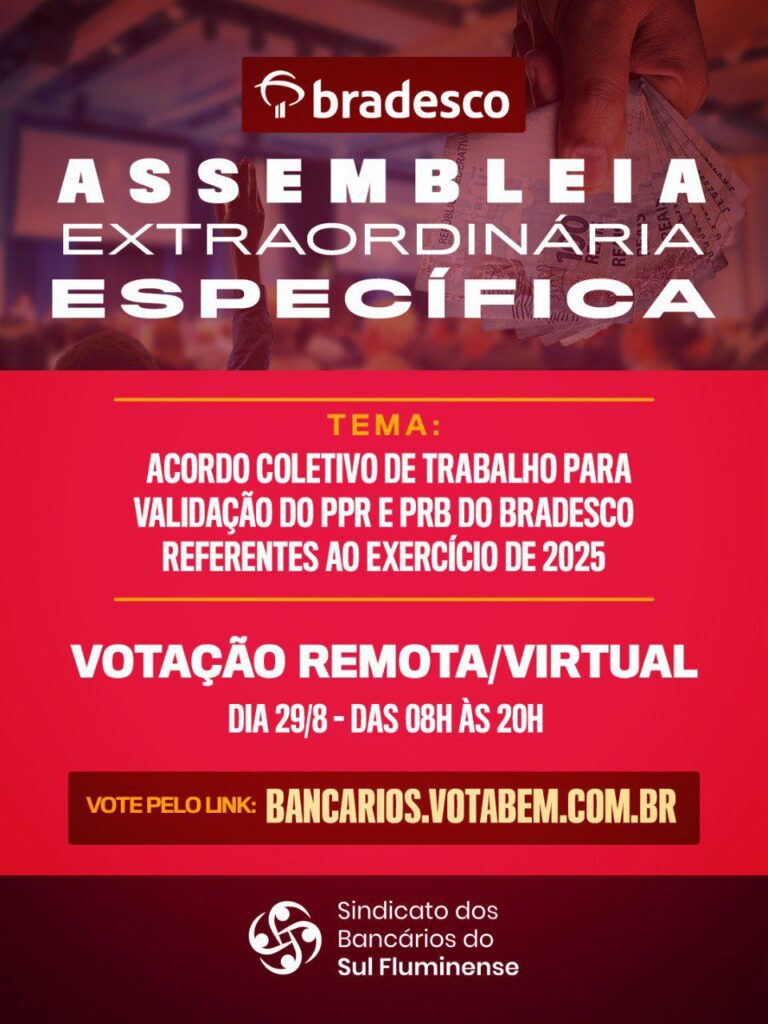 O Sindicato dos Bancários do Sul Fluminense realiza uma Assembleia Extraordinária Específica no próximo dia 29 de agosto, das 8h às 20h, de forma remota pela plataforma https://bancarios.votabem.com.br. Para isso, está convocando todos os empregados do Banco Bradesco S/A, das agências Varejo, Prime e Empresas, das Plataformas Digitais Varejo/ Prime, bem como das agências e escritórios comerciais do Segmento Principal, da estrutura comercial do Bradesco Expresso e aos empregados com o cargo de Gerente Executivo Comercial e Gerente de Atendimento e Operações, sócios e não sócios, e do Banco Bradesco Financiamentos S.A., especificamente os empregados que atuam na área Comercial, sócios e não sócios, da base territorial deste Sindicato. A Assembleia vai deliberar sobre a proposta de Acordo Coletivo de Trabalho que tem por objeto pactuar, reconhecer e validar o Programa de Participação nos Resultados, denominado PPR e o Programa de Resultado Bradesco, denominado PRB, referentes ao exercício de 2025, que, inclusive, trata da autorização do desconto a ser efetuado em função da negociação coletiva, a ser celebrado com o Banco Bradesco S/A e o Banco Bradesco Financiamentos S.A. A base territorial do Sindicato compreende os municípios de Barra Mansa, Volta Redonda, Rio Claro, Porto Real, Quatis, Mendes, Engenheiro Paulo de Frontin, Paracambi, Resende, Itatiaia, Pinheiral, Barra do Piraí, Vassouras, Piraí, Valença e Rio das Flores.