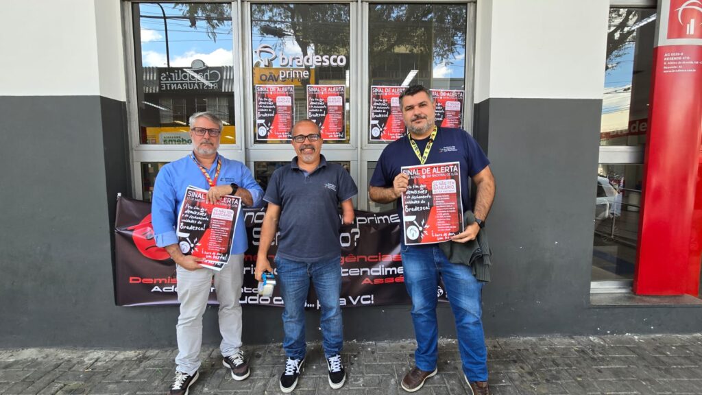O Sindicato dos Bancários do Sul Fluminense participou, nesta terça-feira (12), das ações pelo Dia Nacional de Luta contra as Demissões e o Fechamento de Agências do Bradesco. Os integrantes do Sindicato, tendo à frente o presidente Júlio Cunha, estiveram nas agências de Campos Elíseos, em Resende, e Amaral Peixoto, de Volta Redonda, onde distribuíram o informativo e conversaram os funcionários e clientes, conscientizando sobre a realidade do dia a dia do banco. De acordo com o informativo, nos últimos cinco anos o Bradesco fechou mais de 25 mil postos de trabalho e 1.800 agências, promovendo a demissão de trabalhadores e a precarização no atendimento ao público. Só nos primeiros seis meses de 2025 foram mais de 2.400 demissões em todo o país, de acordo com dados das federações fornecidos à Confederação Nacional dos Trabalhadores do Ramo Financeiro (Contraf-CUT). Apesar de o banco afirmar que está contratando, o volume de admissões é inferior ao de desligamentos. A cada balanço divulgado, o saldo de empregos diminui. Sobre o fechamento das unidades, o Bradesco informa que realiza estudos periódicos sobre sua rede física e que tem trabalhado para reduzir o custo de servir. Entretanto, não apresenta nenhum prazo para encerrar os fechamentos. Outro destaque é a pressão e a sobrecarga sobre os funcionários que permanecem no trabalho.