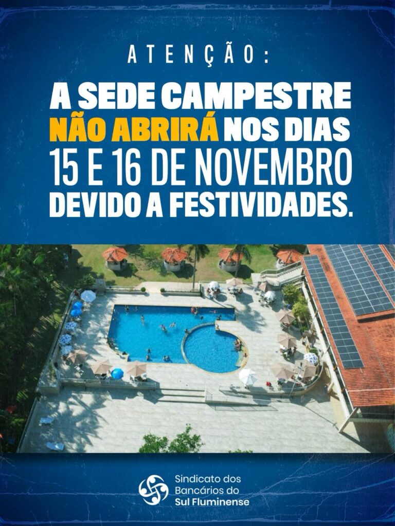 O Sindicato dos Bancários do Sul Fluminense informa a todos os seus associados que, nos dias 15 e 16 de novembro, sua sede campestre ficará fechada devido às festividades programadas para a ocasião.
