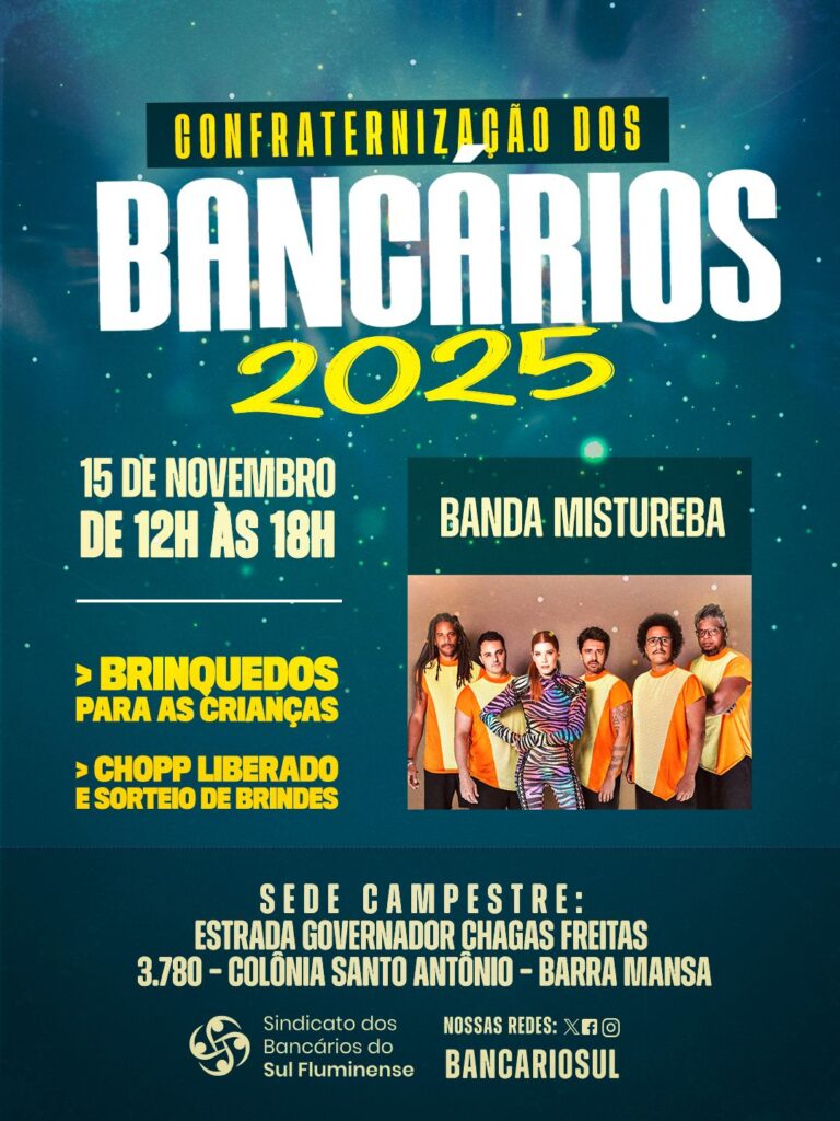 A confraternização dos bancários do Sul Fluminense está marcada para o dia 15 de novembro e você não pode perder. A festa será realizada na sede campestre, das 12h às 18h, com direito a muita diversão para adultos e crianças. A animação musical ficará a cargo da Banda Mistureba, que promete não deixar ninguém parado. Além disso, haverá brinquedos para as crianças, sorteio de brindes e o chopp será liberado. A sede campestre fica na Estrada Governador Chagas Freitas, 3.780 – Colônia Santo Antônio, em Barra Mansa.