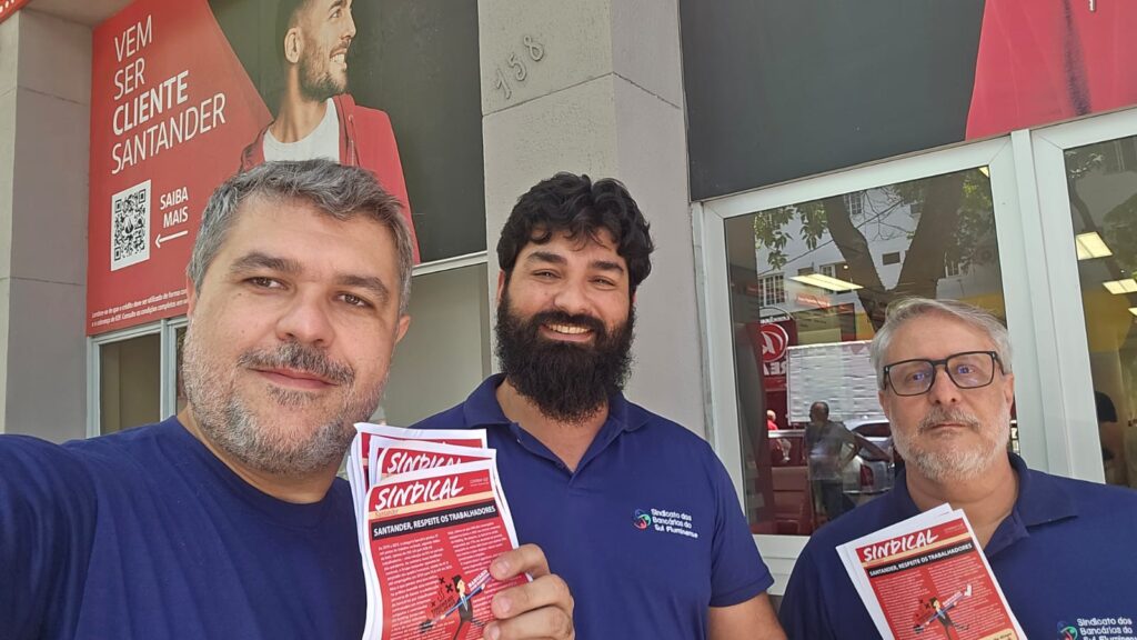 O Sindicato dos Bancários do Sul Fluminense participou, nesta terça-feira (4), do Dia de Luta do Santander, visitando as agências Villa e Amaral Peixoto, em Volta Redonda. A mobilização promovida pelo movimento sindical visa conscientizar os funcionários e clientes do banco sobre a realidade da categoria. De acordo com informativo da Contraf-CUT, distribuído durante a ação, o Santander terceiriza sua própria força de trabalho, transferindo funcionários para empresas coligadas, onde não têm direito aos benefícios previstos na Convenção Coletiva de Trabalho dos Bancários. Essa prática reduz custos e precariza o trabalho. Além de fragilizar a organização sindical, a estratégia compromete salários, PLR, benefícios, direitos e condições de trabalho. Entretanto, impulsiona o lucro do banco, que em 2024 chegou a R$ 13,8 bilhões, com crescimento de 47,8%.