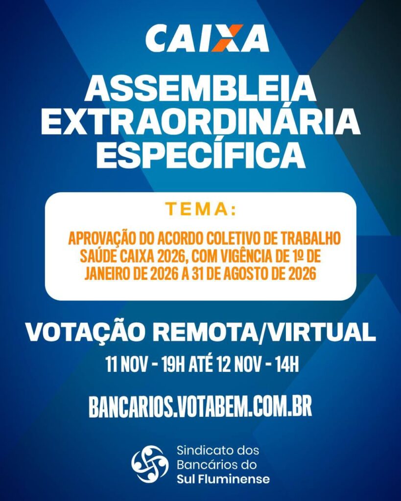 O Sindicato dos Bancários do Sul Fluminense está convocando todos os bancários beneficiários titulares do Saúde Caixa, da base territorial do Sindicato, para assembleia que será realizada nos dias 11 e 12 de novembro, de forma remota, com votação das 19h do dia 11 às 14h do dia 12. A votação ocorrerá pela plataforma https://bancarios.votabem.com.br/ A pauta será a aprovação do Acordo Coletivo de Trabalho Saúde Caixa 2026, com vigência de 1º de janeiro de 2026 a 31 de agosto de 2026. Fazem parte da base territorial do Sindicato os seguintes municípios: Barra Mansa, Volta Redonda, Rio Claro, Porto Real, Quatis, Mendes, Engenheiro Paulo de Frontin, Paracambi, Resende, Itatiaia, Pinheiral, Barra do Piraí, Vassouras, Piraí, Valença e Rio das Flores.