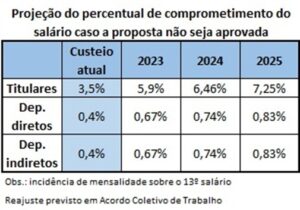 A solução negociada, diante dos saldos deficitários, foi manter a mensalidade do titular em 3,5% da remuneração básica (RB) e cobrar um valor extra dos dependentes, limitado a 7% da RB.