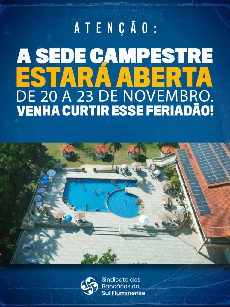 O Sindicato dos Bancários do Sul Fluminense informa aos seus associados que a Sede Campestre ficará aberta neste feriado da Consciência Negra (20/11) e nos dias 21, 22 e 23 próximos, garantindo o lazer para todos.